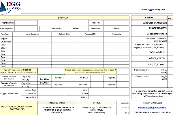 Our comprehensive guides and forms ensure you have all the necessary information at your fingertips. Whether you’re looking for detailed equipment lists, crew forms, or transfer prices, our resources are designed to cover every aspect of your yachting journey. We offer a wide range of documents to help you prepare and enjoy your sailing experience to the fullest.